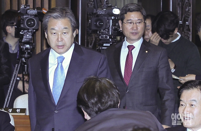 새누리당 김무성 대표와 유승민 원내대표가 3일 오전 서울 여의도 국회에서 열린 새누리당 의원총회에 참석하고 있다.