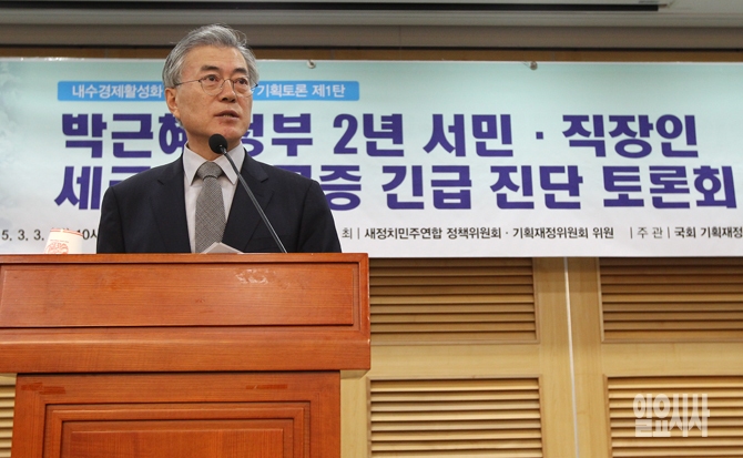문재인 새정치민주연합 대표가 3일 오전 서울 여의도 국회 의원회관에서 열린 당 정책위원회와 기획재정위원회의 '박근혜 정부 2년 서민직장인 세금부담 급증 긴급 진단 토론회'에서 축사를 하고 있다.