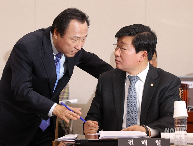 홍일표(사진 왼쪽)·전해철 여야 국회 법제사법위원회 간사가 3일, 서울 여의도 국회에서 열린 법제사법위원회 전체회의에서 논의하고 있다.