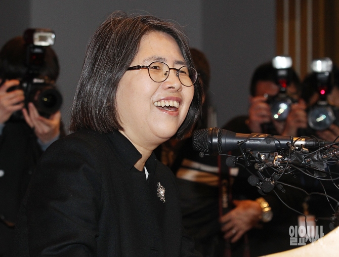 김영란 전 국민권익위원장이 10일 오전 서울 마포구 서강대 다산관에서 '김영란법'(부정청탁 및 금품 등의 수수금지법)을 둘러싼 논란과 관련해 입장을 밝히고 있다.