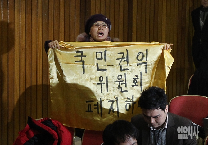 10일 오전 서울 마포구 서강대 다산관에서 김영란 전 국민권익위원장이 '김영란법'(부정청탁 및 금품 등의 수수금지법)'김영란법' 통과에 대한 입장을 밝히고 있는 가운데, 한 시민이 '국민권익위원회 폐지하라'고 적힌 현수막을 들고 기습시위를 벌이고 있다.