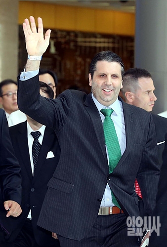 10일, 서울 서대문구에 위치한 신촌세브란스 병원에서 마크 리퍼트 주한미국대사가 피습사건과 관련해 기자회견을 직후 지지자들의 성원에 대한 답례로 손인사를 하고 있다.