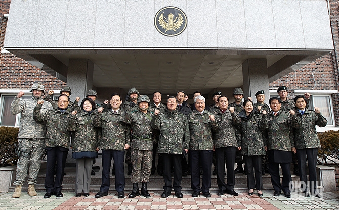 11일, 황진하 국회 국방위원장 등 국방위원들이 한·미연합 FARP(전방지역 무장 장착 및 급유) 훈련이 실시되고 있는 경기도 이천 항공작전사령부를 방문해 시찰 직후 파이팅을 외치고 있다. (국회사진기자단)