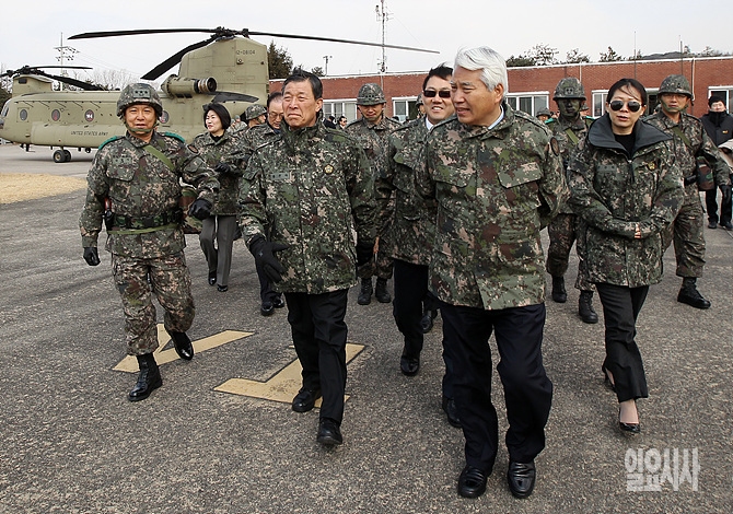 11일, 황진하 국회 국방위원장(사진 왼쪽서 두 번째) 및 백군기(사진 오른쪽서 두 번째) 등 국방위원들이 한·미연합 FARP(전방지역 무장 장착 및 급유)훈련이 실시되고 있는 경기도 이천 항공작전사령부를 시찰하고 있다. (국회사진기자단)