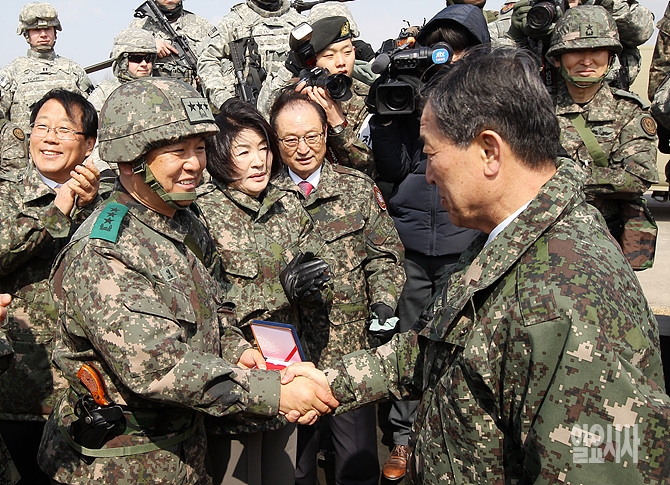 11일, 황진하 국회 국방위원장(오른쪽)이 한·미연합 FARP(전방지역 무장 장착 및 급유) 훈련이 실시되고 있는 경기도 이천 항공작전사령부를 방문해 김영식 항공작전사령관과 악수를 나누고 있다.