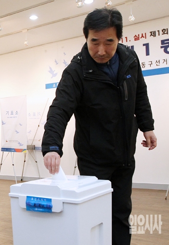 제1회 전국동시조합장 선거일인 11일 서울 천호동 강동구민회관에 설치된 투표소에서 한 조합원이 투표에 참여하고 있다.