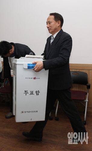 제1회 전국동시조합장 선거일인 11일 오후 서울 천호동 강동구민회관에 설치된 개표소에서 한 선거사무원이 개표를 위해 투표함을 옮기고 있다.
