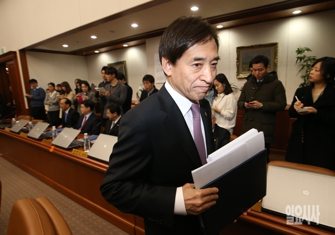 이주열 한국은행 총재가 12일 오전 서울 남대문로 한국은행에서 열린 금융통화위원회 전체회의에 참석하고 있다.