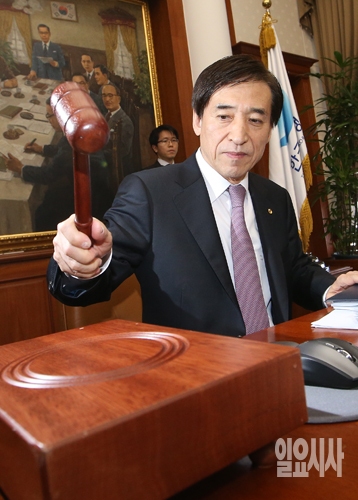 이주열 한국은행 총재가 12일 오전 서울 남대문로 한국은행에서 열린 금융통화위원회 전체회의에 참석해 회의시작을 알리는 의사봉을 두드리고 있다.