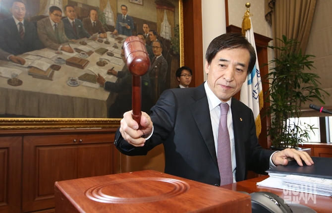이주열 한국은행 총재가 12일 오전 서울 남대문로 한국은행에서 열린 금융통화위원회 전체회의에 참석해 회의시작을 알리는 의사봉을 두드리고 있다.