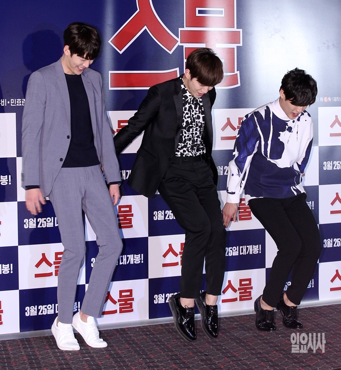배우 김우빈, 이준호, 강하늘이 12일 오후 서울 성동구 행당동 CGV 왕십리에서 열린 영화 <스물>(감독 이병헌) 시사회에서 포즈를 취하고 있다.