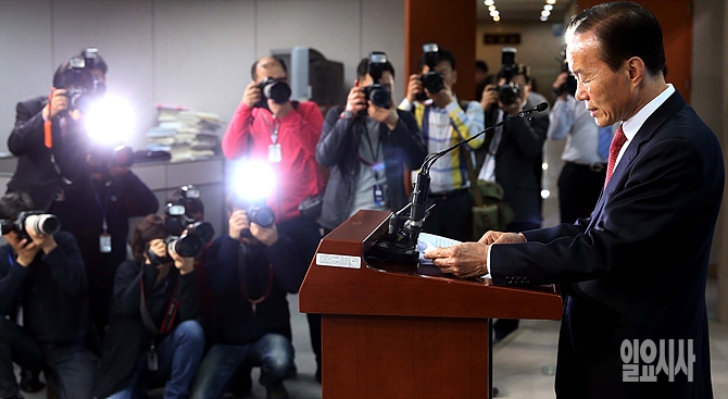 12일 오후, 서울 여의도 국회 정론관에서 새누리당 안덕수 의원이 공직선거법 위반 혐의로 의원직을 잃게 되자, 입장표명을 위해 기자회견을 갖고 있다.