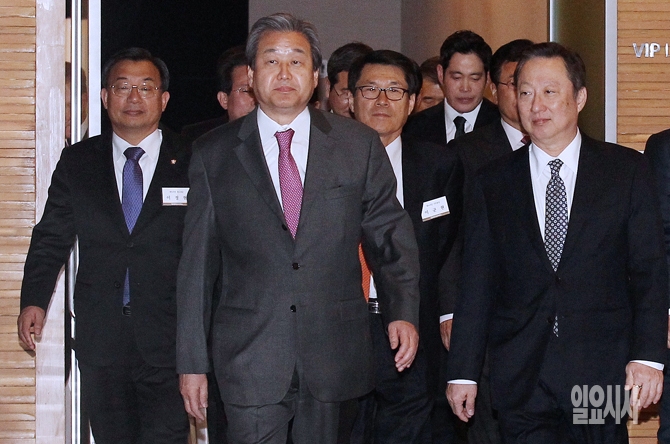 김무성 새누리당 대표, 박용만 대한상공회의소 회장이 16일 오후 서울 남대문로 대한상공회의소에서 열린 '새누리당-대한상공회의소 정책간담회'에 입장하고 있다.