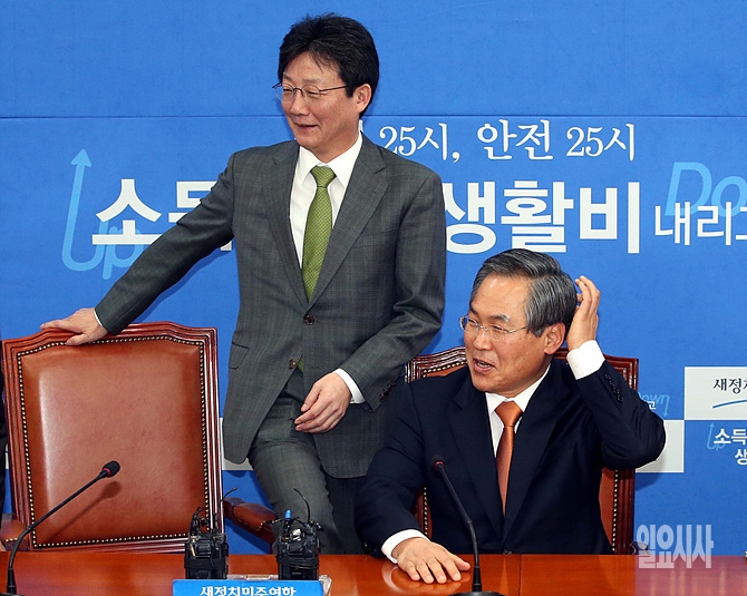 16일, 서울 여의도 국회에서 새누리당 유승민·새정치민주연합 우윤근 원내대표가 주례회동 직전, 웃음 지으며 인사를 나누고 있다.
