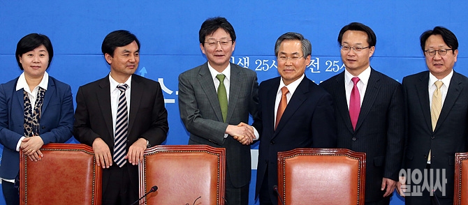 16일, 서울 여의도 국회에서 새누리당 유승민·새정치민주연합 우윤근 원내대표가 주례회동 직전, 악수를 나누고 있다.