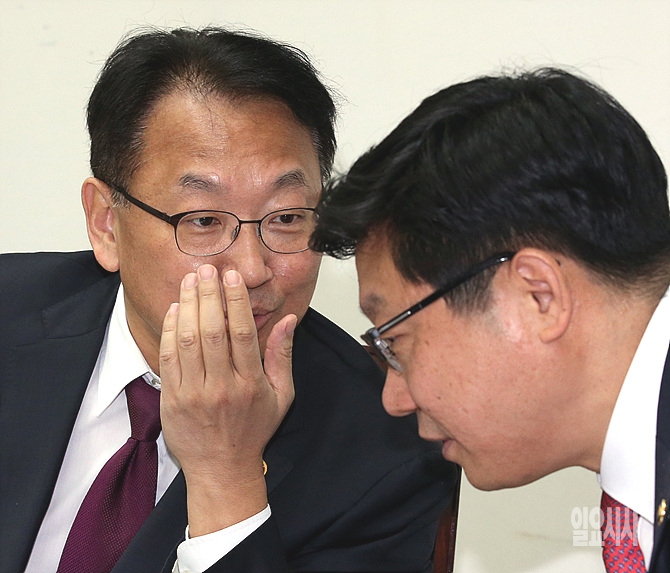 17일, 서울 여의도 국회에서 열린 국회 서민주거복지 특별위원회 도중, 유일호 국토교통부장관이 잠시 한 관계자와 귓속말을 나누고 있다.