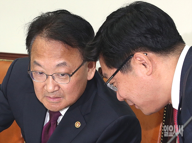 17일, 서울 여의도 국회에서 열린 국회 서민주거복지 특별위원회 도중, 유일호 국토교통부장관이 기획재정부 제1차관과 소곤소곤 이야기를 나누고 있다.