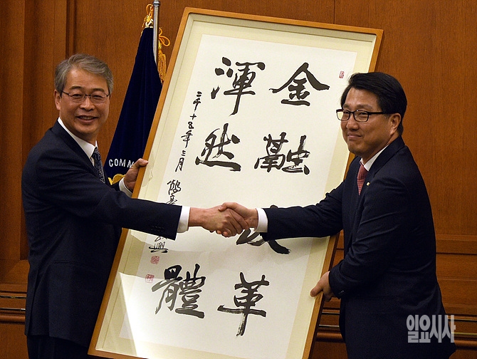 18일, 서울 여의도 금융감독원에서 임종룡 금융위원장(사진 왼쪽)이 진웅섭 금융감독원장에게 액자를 선물하며 악수를 나누고 있다.