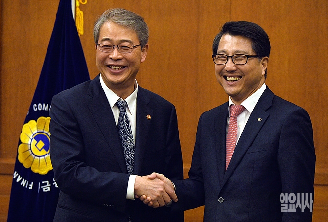 18일, 서울 여의도 금융감독원을 찾은 임종룡 금융위원장이 진웅섭 금융감독위원장과 악수를 나누고 있다.