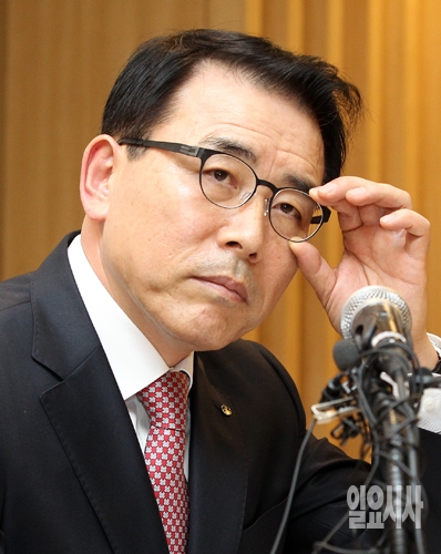 신한은행 조용병 신임 은행장이 18일 오후 서울 중구 태평로 신한은행 본점에서 열린 취임 기자간담회에서 취재진의 질문을 들으며 안경을 매만지고 있다.