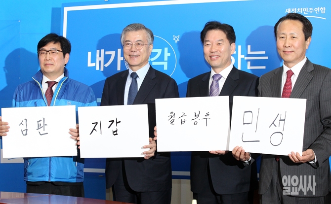 19일 오전 서울 여의도 국회 새정치민주연합 대표회의실에서 열린 4.29 재보궐선거 후보자 공천장 수여식에서 문재인 대표(왼쪽 두번째)와 후보자들이 재보선에 대한 생각을 쓴 피켓을 들어보이고 있다.