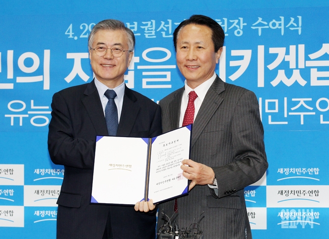 19일 오전 서울 여의도 국회 새정치민주연합 대표회의실에서 열린 '4.29 재보궐선거 후보자 공천장 수여식'에서 문재인 대표가 조영택 광주 서구을 후보자에게 공천장을 수여하고 있다.
