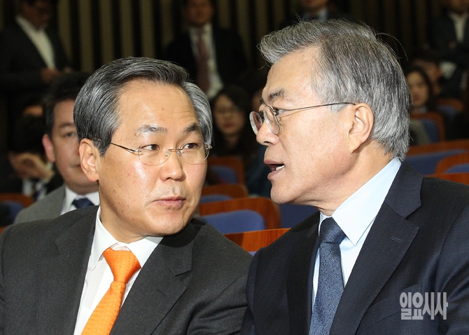 새정치민주연합 문재인 대표(오른쪽)와 우윤근 원내대표가 19일 서울 여의도 국회에서 열린 정책 의원총회에 참석해 대화를 나누고 있다.
