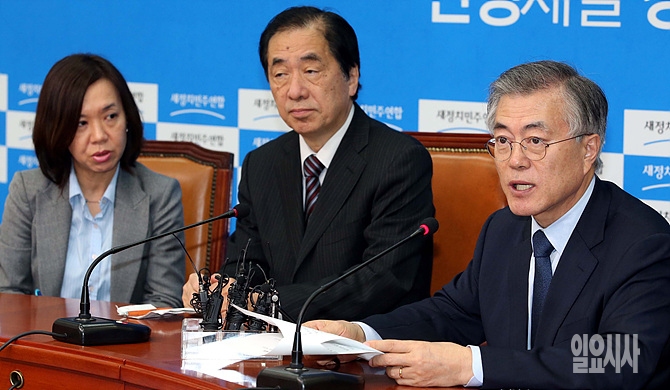 19일, 간 아오토 전 일본총리가 서울 여의도 국회 새정치민주연합 문재인 대표를 예방한 가운데, 문 대표가 발언하고 있다.
