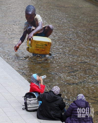 '세계 물의 날'을 앞둔 19일 오후 서울 청계천에 설치된 '물 뜨는 아프리카 아동' 조형물 옆에서 한 외국인 관광객이 물을 마시고 있다. '물 뜨는 아프리카 아동' 조형물은 초록우산어린이재단이 유엔이 매달 3월 22일로 지정한 세계 물의 날을 맞아 극심한 가뭄으로 고통 받는 아프리카 어린이들의 물 부족 현실을 알리려는 취지로 설치됐다.
