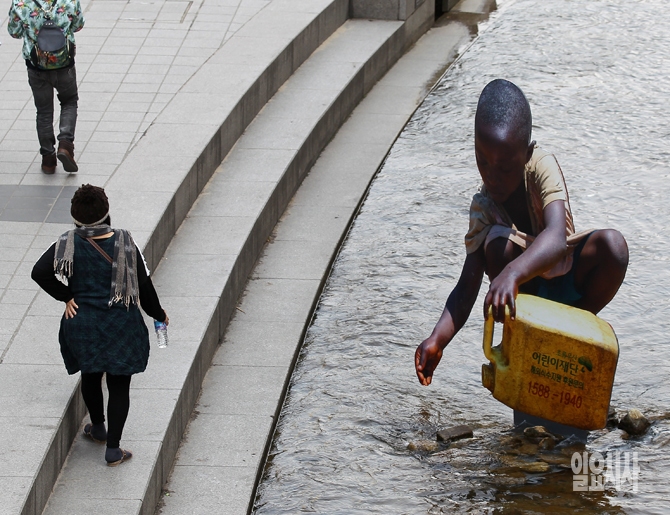 '세계 물의 날'을 앞둔 19일 오후 서울 청계천에 설치된 '물 뜨는 아프리카 아동' 조형물 옆에서 한 외국인 관광객이 생수병을 들고 걸어가고 있다. '물 뜨는 아프리카 아동' 조형물은 초록우산어린이재단이 유엔이 매달 3월 22일로 지정한 세계 물의 날을 맞아 극심한 가뭄으로 고통 받는 아프리카 어린이들의 물 부족 현실을 알리려는 취지로 설치됐다.