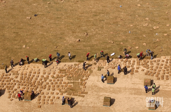 서울의 최고기온이 21도를 기록한 19일 오후 서울시 관계자들이 서울광장에서 잔디 식재작업을 하고 있다. 서울시는 내달 25일부터 시민들에게 광장을 개방한다고 밝혔다.