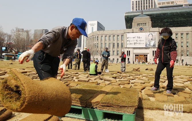 서울의 최고기온이 21도를 기록한 19일 오후 서울시 관계자들이 서울광장에서 잔디 식재작업을 하고 있다. 서울시는 내달 25일부터 시민들에게 광장을 개방한다고 밝혔다.