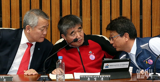 19일, 서울 여의도 국회에서 공무원연금개혁 국민대타협기구 5차회의가 열리고 있는 가운데, 한국공무원노총 류영복 위원장 및 관계자들이 이야기를 나누고 있다.