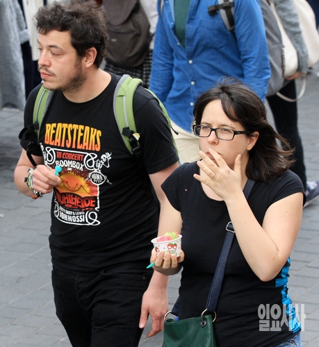 전국적으로 완연한 봄날씨를 보인 20일 오후 서울 명동에서 반팔을 입은 관광객들이 아이스크림을 먹으며 걷고 있다.
