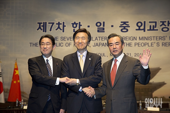 기시다 후미오 일본 외무상, 윤병세 외교부 장관, 왕이 중국 외교부장(사진 왼쪽부터)이 21일, 서울 신라호텔서 열린 제7차 한중일 외교장관회의 직전 함께 손을 맞잡고 기념촬영을 하고 있다. (현장풀)