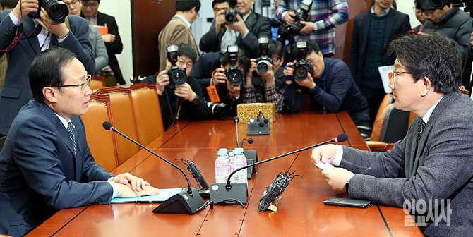 23일, 서울 여의도 국회에서 해외자원개발 국정조사특위 권성동(사진 오른쪽)-홍영표 여야 간사가 회동을 갖고 있다.