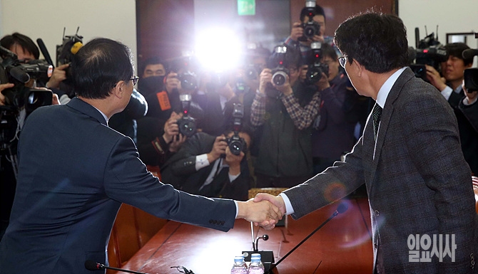 23일, 서울 여의도 국회에서 해외자원개발 국정조사특위 권성동(사진 오른쪽)-홍영표 여야 간사가 회동 직후, 악수를 나누고 있다.