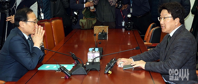 23일, 서울 여의도 국회에서 해외자원개발 국정조사특위 권성동-홍영표 여야 간사가 회동을 갖고 있는 가운데, 권 간사가 발언하고 있다.