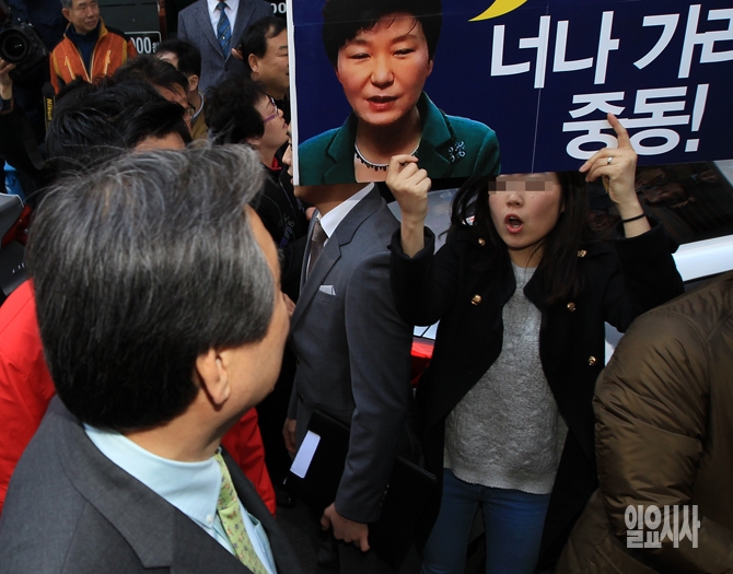 김무성 새누리당 대표가 23일 오후 서울 관악구 신림동에서 청년 1인 가구 관련 타운홀 미팅을 하기 위해 북카페로 이동하고 있다. 이날 김 대표의 고시촌 방문에 반대하는 한국청년연대 회원들이 피켓 시위를 였다.