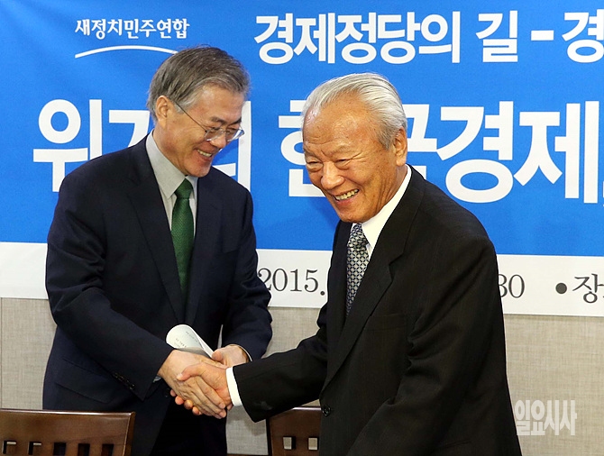 23일, 서울 여의도 국회의원회관 의원식당에서 '위기의 한국경제, 해법을 말하다'를 주제로 경제정당의 길-경제석학과의 간담회 직전, 문재인 새정치민주연합 대표와 박승 전 한국은행 총재가 악수를 나누고 있다.