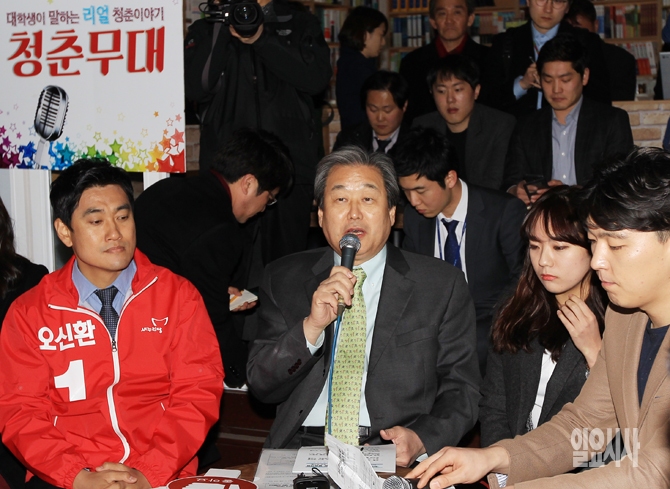김무성 새누리당 대표가 23일 오후 서울 관악구 대학동에서 원룸·고시촌을 방문한 뒤 청년주거 문제를 주제로 타운홀 미팅을 하고 있다.