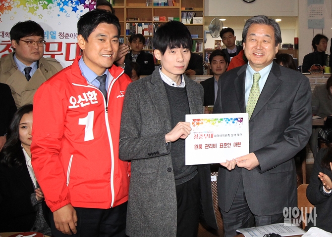 김무성 새누리당 대표가 23일 오후 서울 관악구 대학동에서 원룸·고시촌을 방문한 뒤 청년주거 문제를 주제로 타운홀 미팅을 열었다. 김 대표가 행사에 참가한 한 청년으로부터 정책제안서를 전달받고 있다.