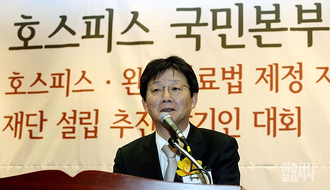 23일, 서울 여의도 국회 도서관 대강당에서 '호스피스 국민본부 선언 및 설립추진 발기인대회'가 열린 가운데, 새누리당 유승민 원내대표가 축사를 하고 있다.