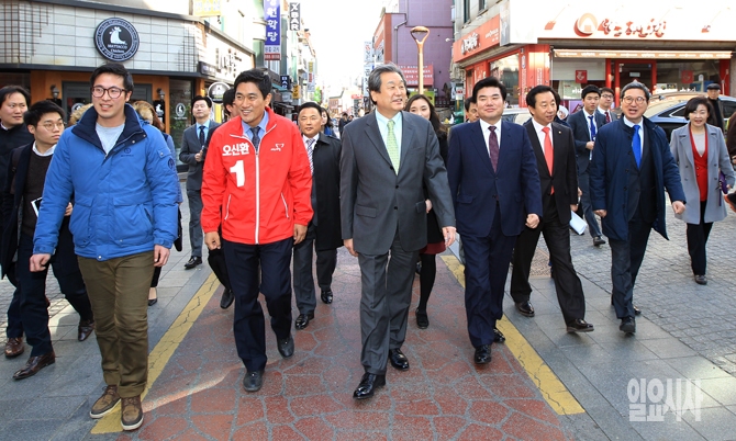 김무성 새누리당 대표가 오신환 재보선 관악을 후보와 함께 23일 오후 서울 관악구 대학동 원룸·고시촌 주변을 둘러보고 있다.