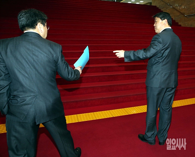 24일, 서울 여의도 국회 로텐더홀에서 공무원연금개혁을 위한 국민대타협기구 여야 공동위원장인 새누리당 조원진(사진 오른쪽)·새정치민주연합 강기정 의원이 이야기를 나누고 있다.