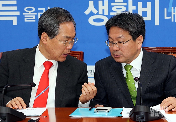 24일, 서울 여의도 국회에서 새정치민주연합 원내대책회의가 열린 가운데, 우윤근 원내대표(사진 왼쪽)와 강기정 정책위의장이 이야기를 나누고 있다.