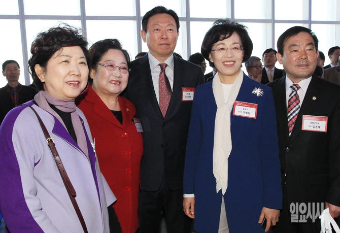 24일 서울 송파구 잠실 제2롯데월드 공사현장에서 열린 '롯데월드타워 100층 돌파 및 안전기원식'에서 참석자들이 포즈를 취하고 있다. 왼쪽부터 새누리당 박인숙 의원, 김을동 의원, 신동빈 롯데그룹 회장, 박춘희 송파구청장, 임춘대 송파구의회 의장.