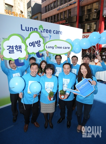 한국얀센 김옥연 대표이사를 비롯한 임직원과 대한결핵협회, 구세군 관계자들이 24일 결핵예방의 날을 맞아 서울 명동예술극장 앞에서 결핵 예방과 인식향상을 위한 ‘Lung Tree Care’ 캠페인을 선보이고 있다.