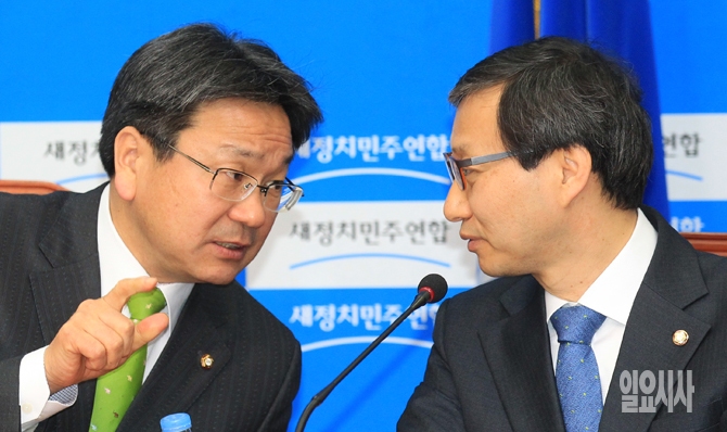 강기정 새정치민주연합 정책위의장과 김성주 의원이 25일 국회에서 '공무원연금 재구조화 모형'을 설명한뒤 대화를 나누고 있다.