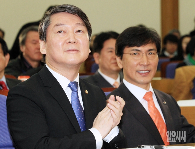 안철수 새정치민주연합 의원과 안희정 충남도지사가 25일 오전 서울 여의도 국회의원회관에서 열린 '경제성장을 위한 복지투자' 좌담회에 나란히 앉아있다.